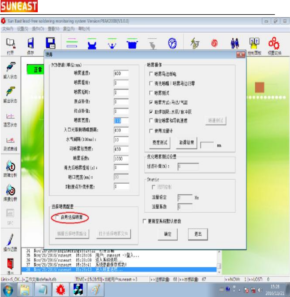 电 脑 波峰 焊 用 户 手册 70 / 7 3 3. 再 次 启 用 选择 性 喷雾 则 只 需 打开 【 喷雾 设置 】 打 钩 【 启 用 选择 性 喷雾 】 , 然 后点 击 【 确 定 】 退 出 设置 。 suneast production