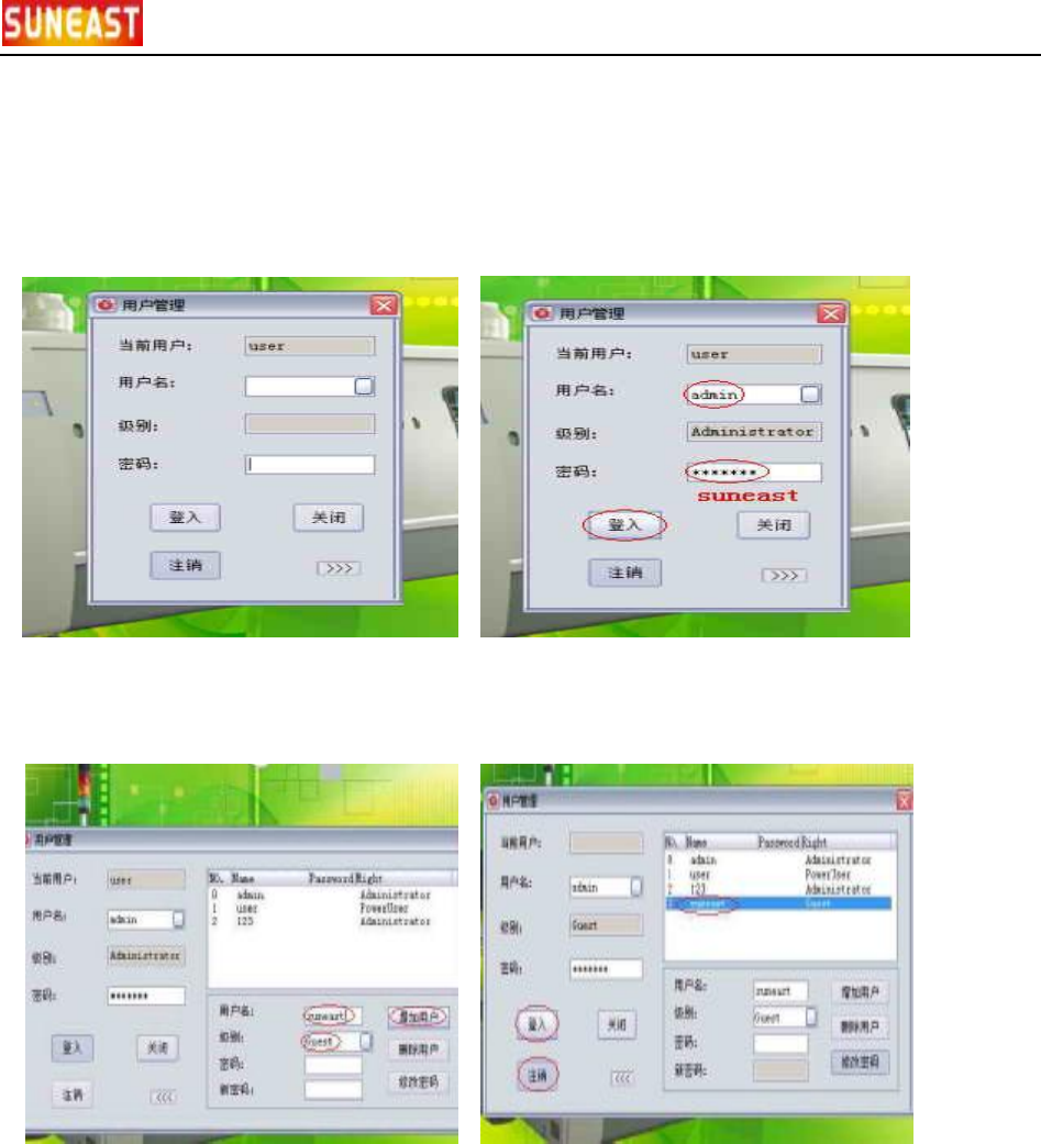 1)按压“用户登入”按钮 2)选择用户名为“admin”,输入密码“suneast”