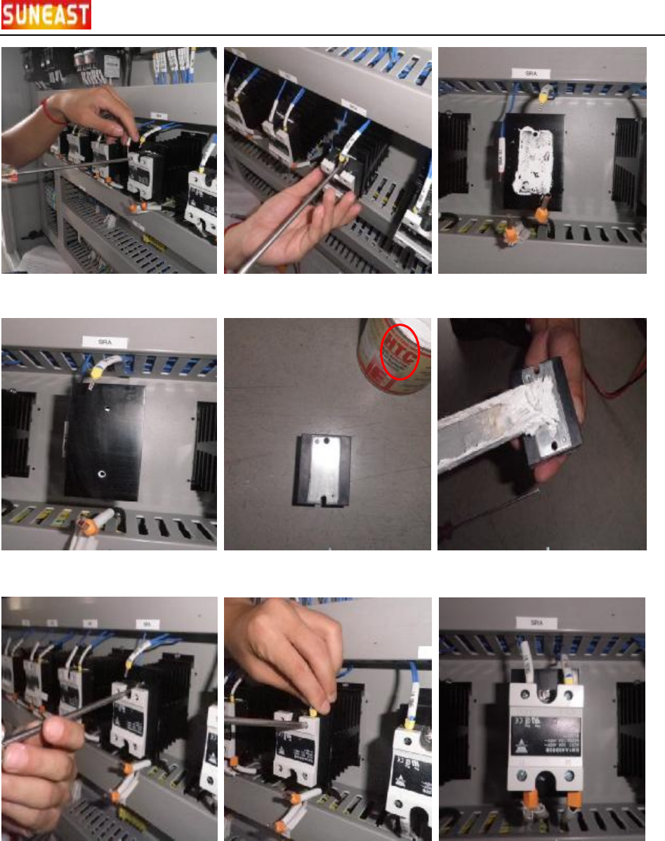 检查固态继电器,找出其中的损坏件,拧下上、下两端固定螺丝,将损坏件从散热铝板上拆下,如