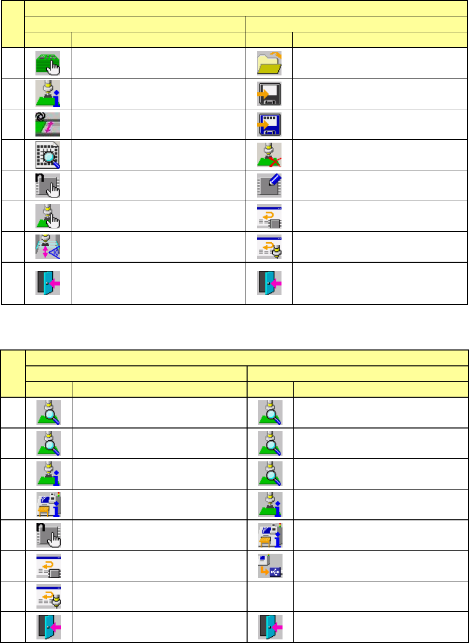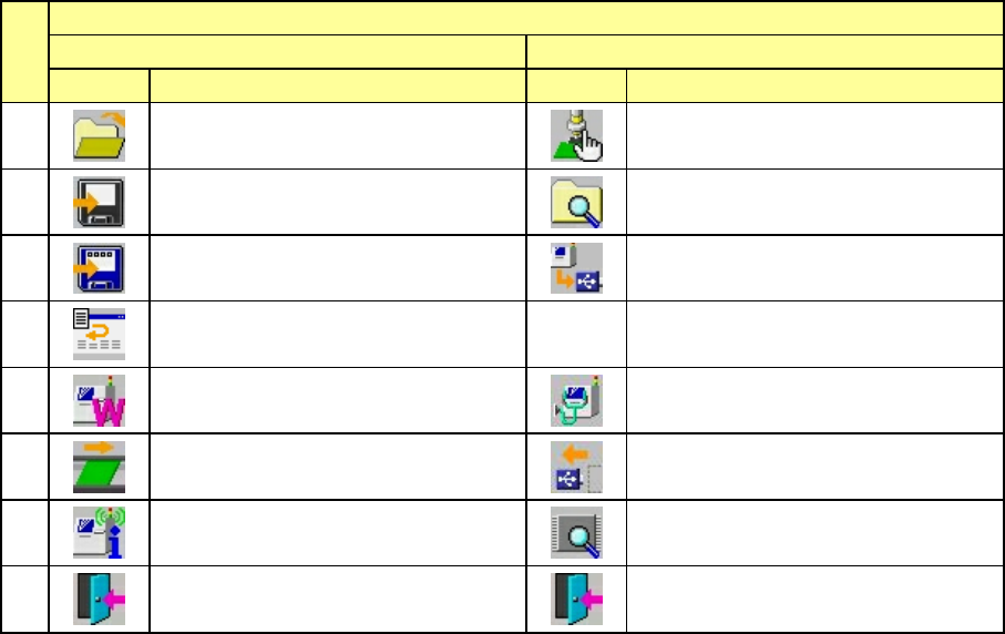 第 1 部 基本篇 第 1 章 装置概要 1-83 (1)桌面的命令按钮 No. 页 1/2 2/2 图标 名称 图标 名称 1 打开 读入生产程序文件。 操作选项 2 保存 保存生产程序。 文件管理(资源管理器) 3 另存为 另外命名生产程序文件名后保存。 设备信息的取得和保存 取得设备信息,予以保存。 4 打印 5 预热 机器自诊功能 6 通过 硬件安全拆卸 7 机器管理信息 关于程序 显示系统的各种版本 8 退出 结束系统 退出 …