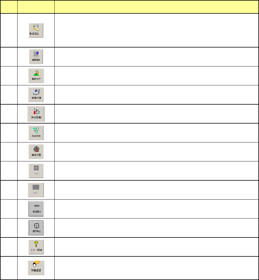 第 1 部 基本篇 第 1 章 装置概要 1-88 1-8-4-3 功能栏 使用功能栏,进行各项应用程序的退出、启动、示 教、跟踪、语言切换等操作。 功能栏上的按钮,可以用轨迹球或触摸屏进行操作 。 通过功能栏可以快速切换已经启动的应用程序。 在功能栏上可操作下列应用程序: 1. 取得日志 2. 桌面 3. 编辑程序 4. 生产 5. 机器设置 6. 手动控制 7. 自动校准