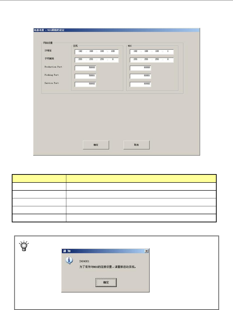 第2部 功能详解篇 第1 3章 选项组件 13-199 13-26-2-3 MDS 网络设定 实施与 MDS 进行通信的网络设定。 从机器设置选择「设置组」-「 MDS 网络的设定」 。 <设置内容> 项目 内容 IP 地址 设置 IP 地址。 子网掩码 设置子网掩码。 Production Port ※ 1 设置 Production 端口用的端口编号 Picking Port ※ 1 设置 Picking 端口用的端口编号 Serv…