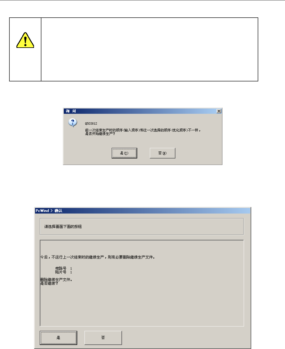 (2) 在可继续生产的状态下,选择不继续生产时,会显示提示,要求确认是否删除继续生产文件。