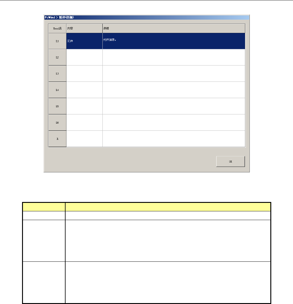 第 1 部 基本篇 第 2 章 生产 2-179 2-15-1-4 详细信息 在暂停画面上按 [ 详细信息 ] 按钮时,会显示详细信息画面。 (1) 错误 Head 一览 显示暂停时的 Head 状态一览。 项目 内容 Head 名 显示 Head 号。 内容 正常完成贴片时,显示元件的定心方式。 如果发生了错误,则显示错误内容的大分类。 与重试列表显示的大区分相同。 详细情况请参见 「 2-1 1-4-2 显示 ( 2 ) 重试列表(…