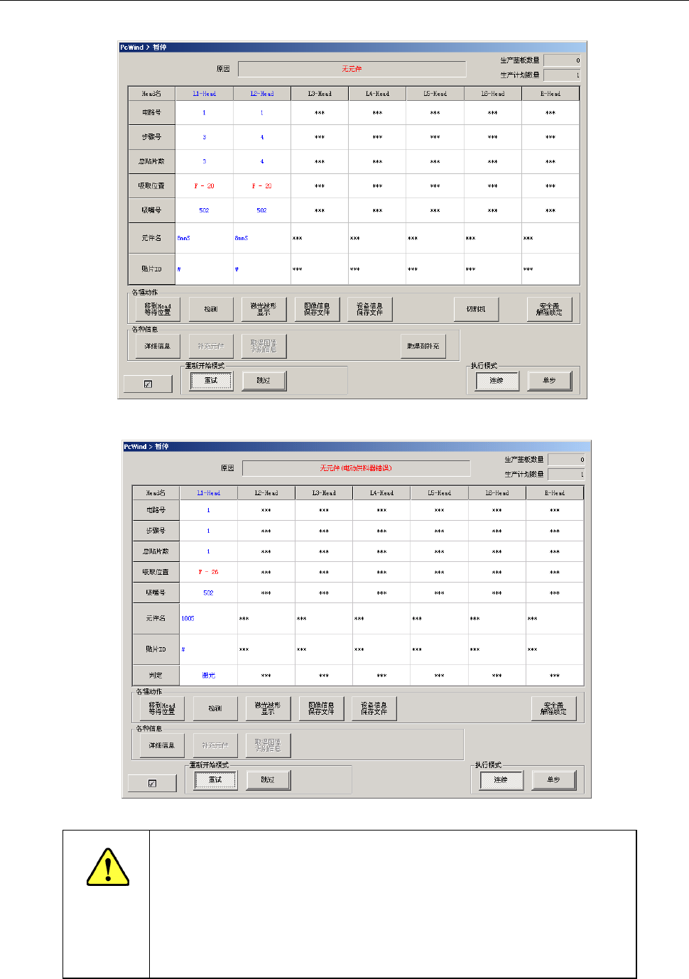 如果勾选了操作选项的[无元件暂停后,重新运行时跟踪吸取]选项,则在重新开始生产前,会显示设