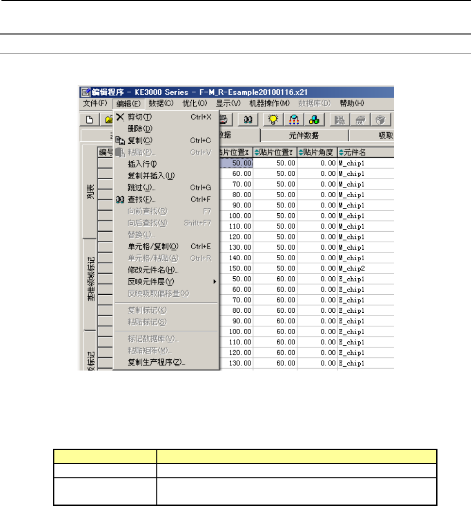 第 1 部 基本篇 第 4 章 制作生产程序 4-157 (1) 剪切 剪切被选中的行。 * 本项命令,在使用排序功能时不能选择。 (2) 删除 删除被选中的行。 * 本项命令,在使用排序功能时不能选择。 (3) 复制 将选中的行登录到内存中。要粘贴在数据中时,请执行下列粘贴命令。 (4) 粘贴 用上述复制命令所选择的行的数据被粘贴。 并且,如用贴片数据选择粘贴命令,会显示如下画面。 1) 复制次数 :指定复制次数。 2)X 间距 :指…