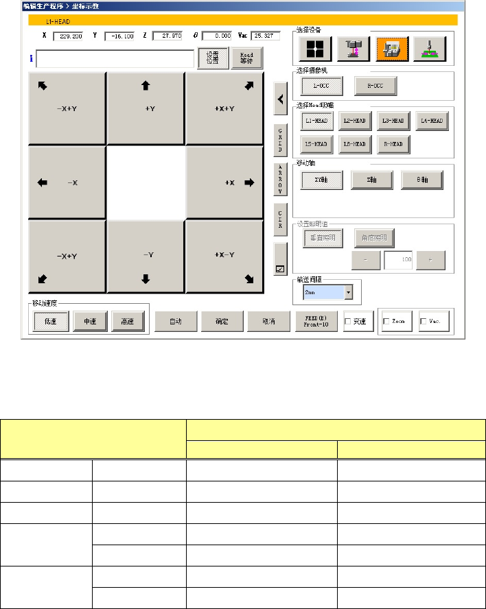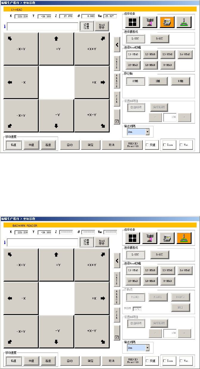 第 1 部 基本篇 第 4 章 制作生产程序 4-184 ( 2) 使用 Head 的各吸嘴进行示教的方法 在选择装置时,选择了 Head 装置、或选择 Head ( Head )吸嘴时选择各 HEAD 后, Head 会移 动到当前显示的坐标上。 1)XY 轴移动 选择移动轴的 [XY 轴 ] 按钮,用 8 个方向按钮使 XY 轴移动。 在 X 、 Y 各自的文本框里会显示出当前的 XY 坐标。 (3) 使用坏板标记进行示教的方法 在…