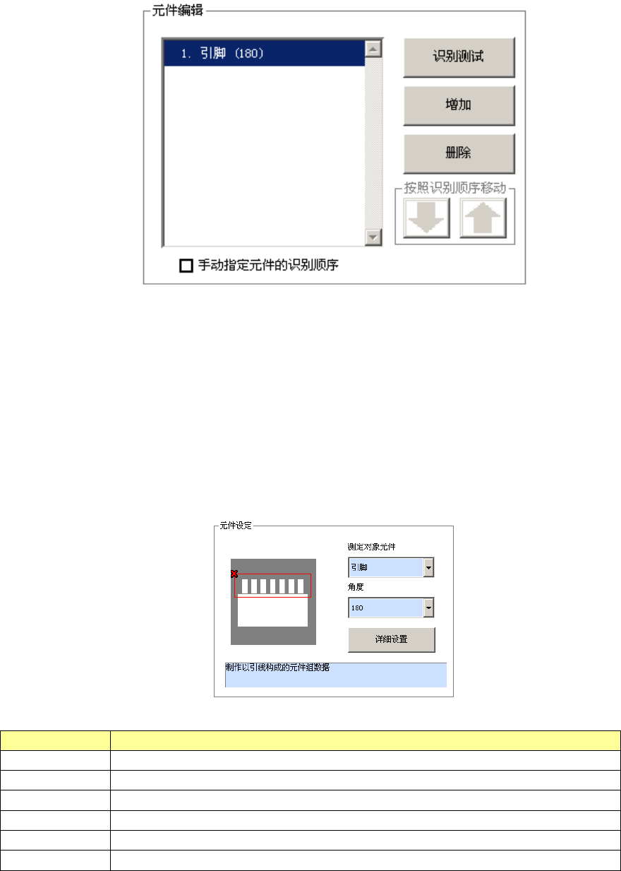 第 1 部 基本篇 第 4 章 制作生产程序 4-296 g ) 元件编辑 ( 通用图像元件 ( 引脚、外形 )) 进行多个元件组的追加、删除、 识别顺序的设置。另外, 也可进行识别测试。在元件编辑初始 状态下,会自动转移到元件设置画面。 ① 要新追加元件组时,需按 [ 增加 ] 按钮。 对追加元件的类型、角度进行设置,追加元件组。另外, 按下详细设置按钮时,会显示详 细设置对话框,可进行更加细致的设置。 ② 要删除已有的元件组时,选择…