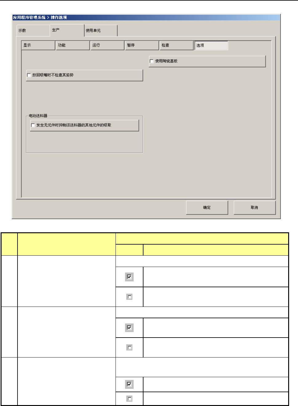 第2部 功能详解篇 第7章 操作选项 7-20 7-3-6 选项 按下[选项]按钮时,会显示 “ 生产时的选项设置画面 ” 。 No. 项目 内容 状态 动作及详细内容 1 使用陶瓷基板 设置是否使用陶瓷基板用的补偿量。 根据 「机器设置」 中设置的陶瓷基板用的推挤补偿 量按压支撑台。 根据 「机器设置」 中设置的按压普通基板补偿量按 压支撑台。 2 放回吸嘴时不检查其姿势 设置是否在放回吸嘴时检查吸嘴的姿势。 对生产中的基板搬送时, …