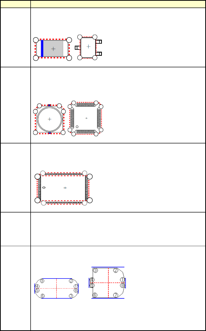 第 2 部 功能详解篇 第 9 章 手动控制 9-19 选择各种元件形状时的动作如下: · 元件形状和 SWEEP 动作 元件形状 动作 无缺角 从测量数据中检测 4 个顶点,进行位置偏差、角度偏差的计算 · 校正。 无缺角、近似四边形形状的元件可设置此种元件形状。 相当于编辑生产程序设置元件数据时的无缺角的元件形状。 2 3 4 1 21 34 有缺角 从测量数据中检测 5 ~ 8 个顶点,进行位置偏差、角度偏差的计算 · 校正。 元…
