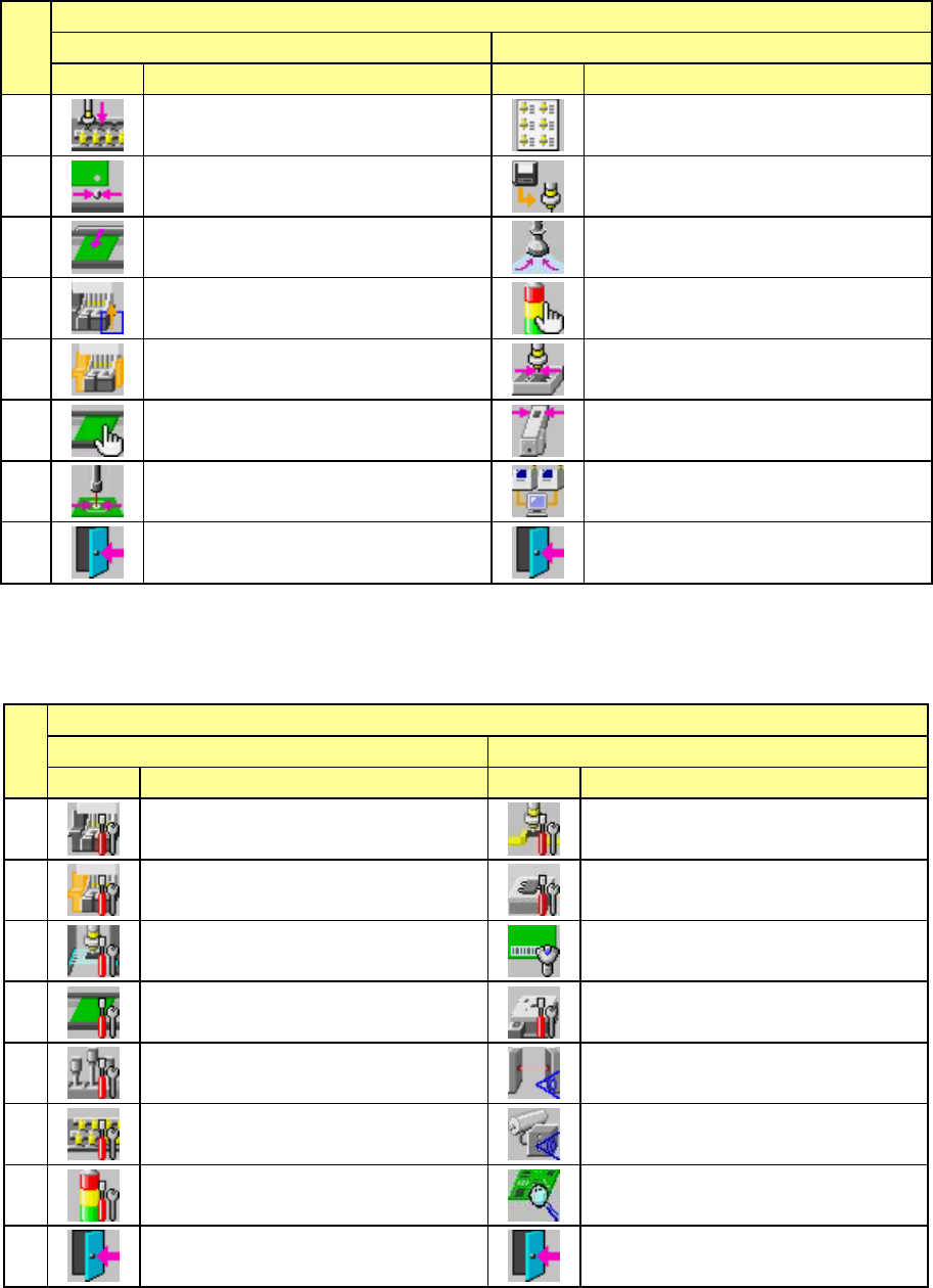 第 1 部 基本篇 第 1 章 装置概要 1-84 (2)生产的命令按钮 生产部根据情况使用 2 种类型的命令按钮。 1 )生产控制、空运行状态 2 )生产控制、生产中 No. 页 1/2 2/2 图标 名称 图标 名称 1 生产条件画面 打开 2 生产管理信息 ( 综合 ) 保存 3 支援准备 另存为 4 检查生产程序 删除继续生产文件 5 设置元件数 编辑数据 6 操作选项 重试列表(未贴片) 7 检测激光高度 重试列表(供应设备)…