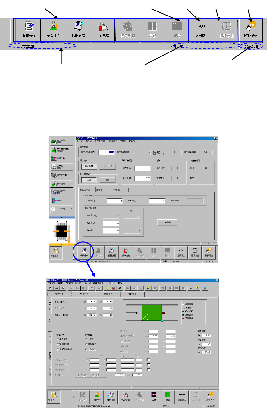按动程序启动按钮,机器可以快捷地启动和切换编辑、基板生产、机器设置、手动控制、自动校准等