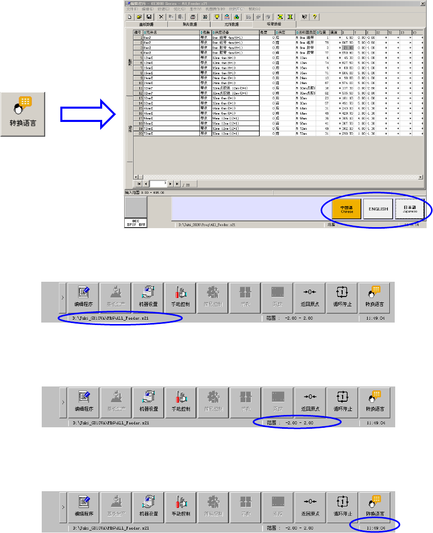 第 1 部 基本篇 第 1 章 装置概要 1-93 语言切换按钮 : 按下 [ 转换语言 ] 按钮后,可显示转换语言对话框,转换显示语言 。 生产程序名称 : 显示当前正在使用的生产程序名称。 范围显示栏 : 显示当前有光标编辑框的输入范围。 时间显示栏 : 显示当前的时间。