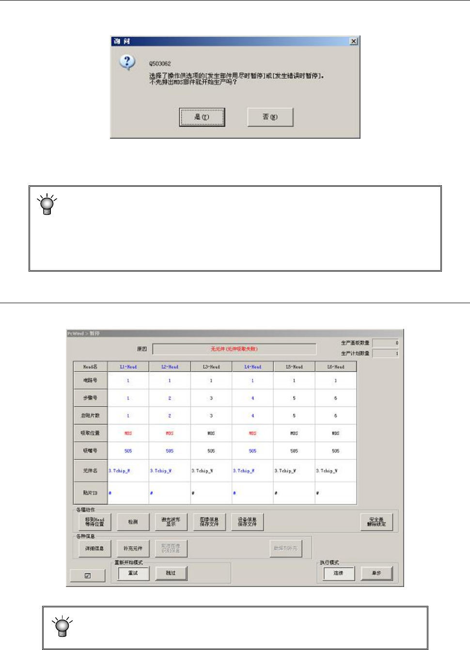 第2部 功能详解篇 第1 3章 选项组件 13-206 13-26-5-3 开始生产时 在设置了操作供选项的『发生 部件用尽时暂停』或者『发 生错误时暂停』时,在开始生 产时显示 以下信息。 选择[是],则不先排出 MDS 元件即开始生产 选择[否],则退出开始生产,返回生产条件画面。 先排出 MDS 元件是指 贴片机在吸取、贴片动作中, MDS 准备下一元件的动作。 选择了『发生部件用尽时暂停』或者『发生错误时暂停』 ,则不能实施先排…