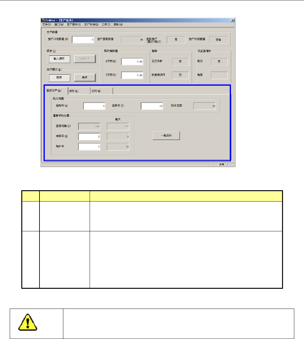第 1 部 基本篇 第 2 章 生产 2-45 2-8-2-2 个别设定项目 (1) 基板生产 No. 项目 内容 1 贴片范围 需要限定贴片范围时,输入开始号和结束号。 在总贴片点 数项 目 中 可 显示 每 1 电路的总贴片步 骤号。 此项设置限于设定为输入顺序 时。 2 重新开始位置 因某些原因生产中断、基板被释放的情况下需要继续贴装剩余元 件、完成基板贴片时,可指定重新开始位置。 此外,也可从特定的位置进行贴片。 本设定仅对最…