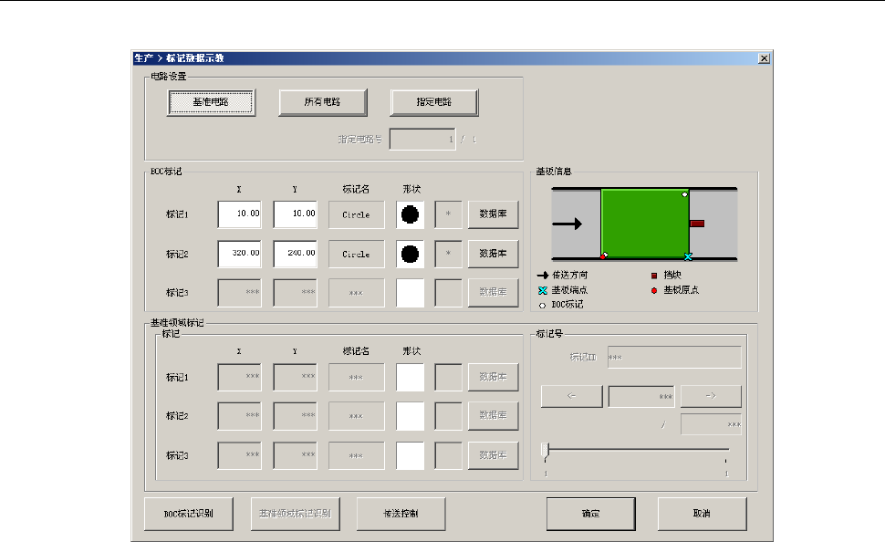第 1 部 基本篇 第 2 章 生产 2-1 17 2-12-1-5 标记数据示教 可显示 BOC 标记、基准领域标记,并对其进行确认检查。 (1) 电路设置 设置识别 BOC 标记、或基准领域标记的电路。 可选择设置基准电路、所有电路、指定电路。 (2)BOC 标记 可以进行各 BOC 标记的位置示教。 进行示教时,要通过功能栏的示教进行输入。 此时,输入焦点无论在 XY 任何一方, XY 可同时自动反映对应值。 (3) 基准领域标记…