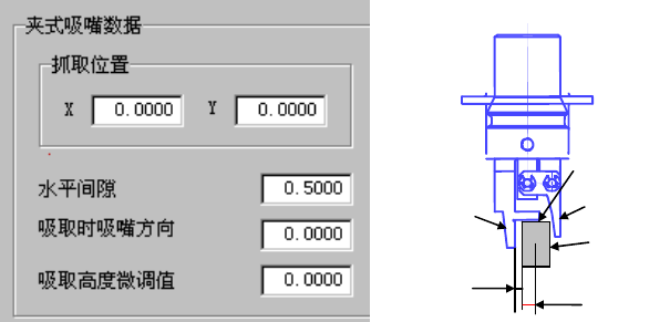 ①抓取位置 “Y”项,输入元件中心至夹式吸嘴固定侧手臂抓取面(紧贴面)中心的偏