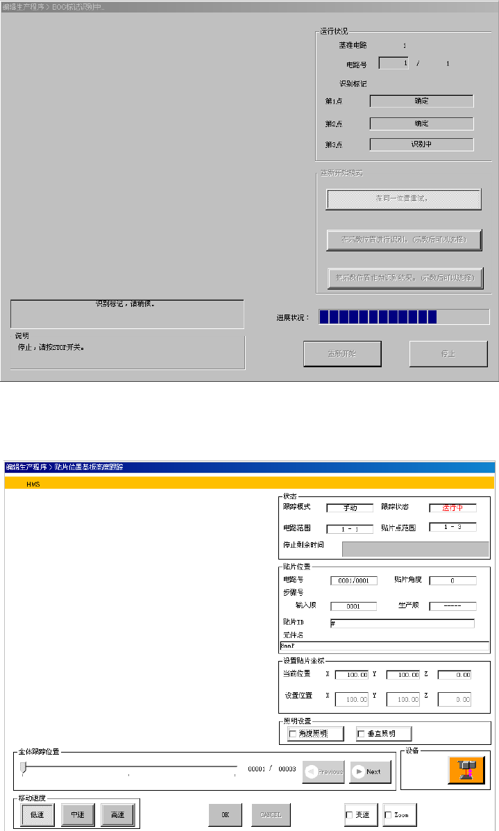 第 1 部 基本篇 第 4 章 制作生产程序 4-231 1) 状 态 a) 跟踪模式 显示在输送方法中设置的「手动」或「自动」 。 b) 电路范围 显示实施高度测量的电路的范围。 c) 贴片点范围 显示实施高度测量的贴片点的范围。 d) 跟踪状态 「动作中」表示轴正在移动中。 「暂停」表示在自动输送中的暂停。 「停止」表示手动输送或 根据需要处于停止状态。 「轴待避中」表示轴正在移动到安全位置。 「标记识别中」表示正在识别 IC 标记…