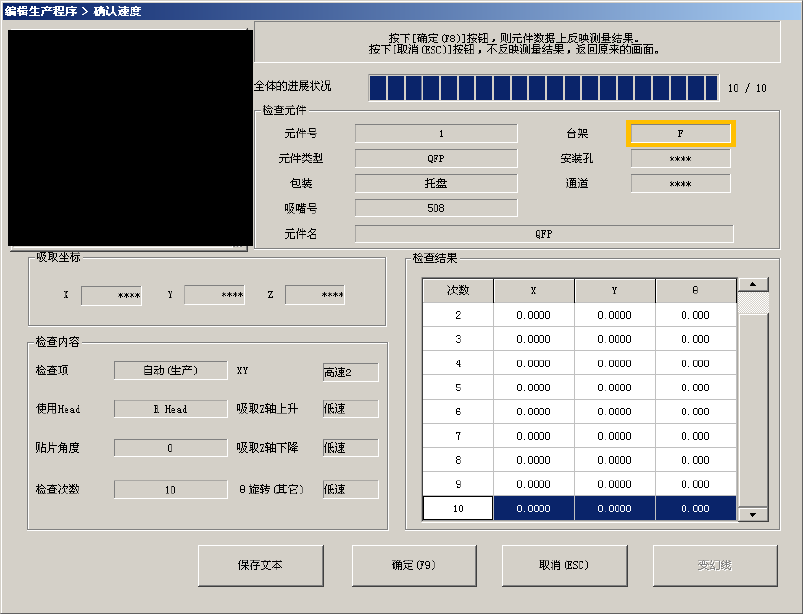 确认速度时会出现下列对话框,显示正在确认速度的元件内容及吸取位置,逐项地实时显示运