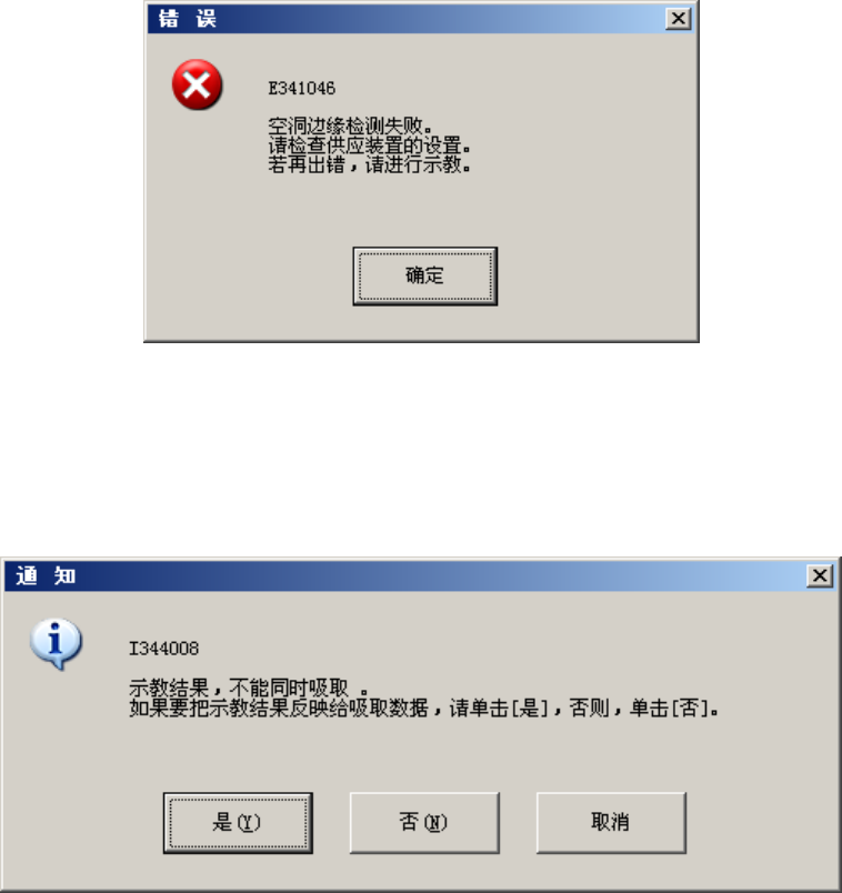 第 1 部 基本篇 第 4 章 制作生产程序 4-279 4) 空洞边缘检测失败时 空洞影子的边缘框检测失败时,显示如下错误提示。 5) 因自动示教出现不能同时吸取时 出现不能同时吸取时,显示如下询问。 精度优先的情况下请按 [ 是 ] ,速度优先的情况下请按 [ 否 ] 。