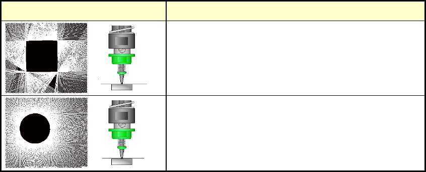 第 2 部 功能详解篇 第 9 章 手动控制 9-22 变幻线和激光高度 说明 激光高度在元件上面和吸嘴边缘时,同上面情况一样, 有的地方激光面遮盖不全,出现 SWEEP 失败。 激光高度只达到吸嘴尖端而未达到元件时, 变幻线显示 出吸嘴尖端的形状。