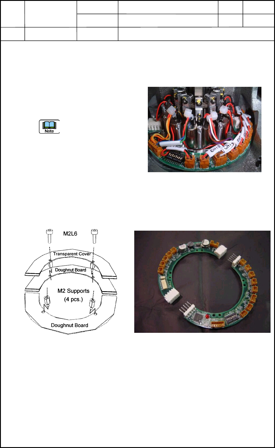 Device Name Chip Mounter Block Name Page No. Unit Name Revision Model Item GXH -1 Chapter 5 Head Section 3. Replacement of Doughnut Board UB22 3.2 Attachment of Doughnut Board (1) Put the doughnut boards (in the disconne…
