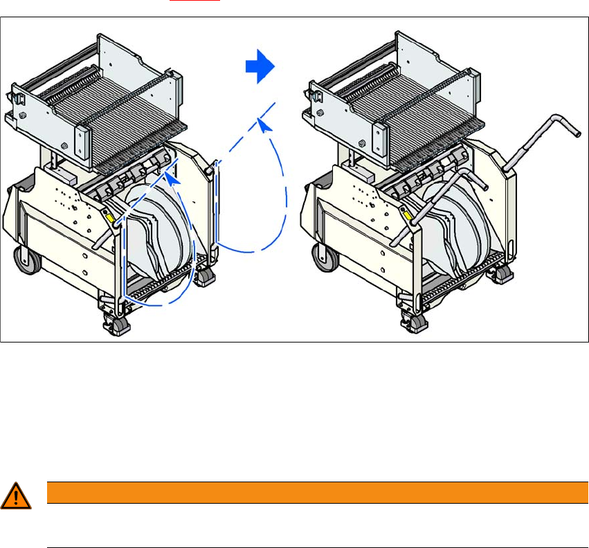 请注意装满供料器模块的料车在倾斜 20° 或更大的角度时,会发生侧翻或前倾。