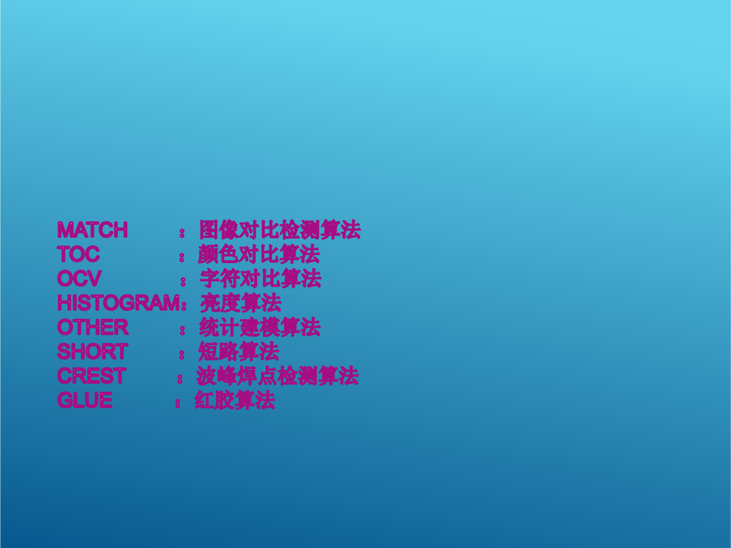 MA TCH 算法 : (应用模式: 锡膏板,红胶板 ,波峰焊 ) Match 算法 : 一般应用在元件本体 , 主要起定位作 用 利用元件框框住所需要检测的区域并生 成标准图 , 然后以此标准图与其它的元件本体进行 图片的对 比检测 , 左图中上下限为图片的差异 范围值 也就是说标准图与待测图之间的图像相 差值在设 定的范围之类则 OK, 否则 NG OK, NG 此算法主要检测图像差异 算法扩展应用 : 可以应用在字符上,如右图 把…