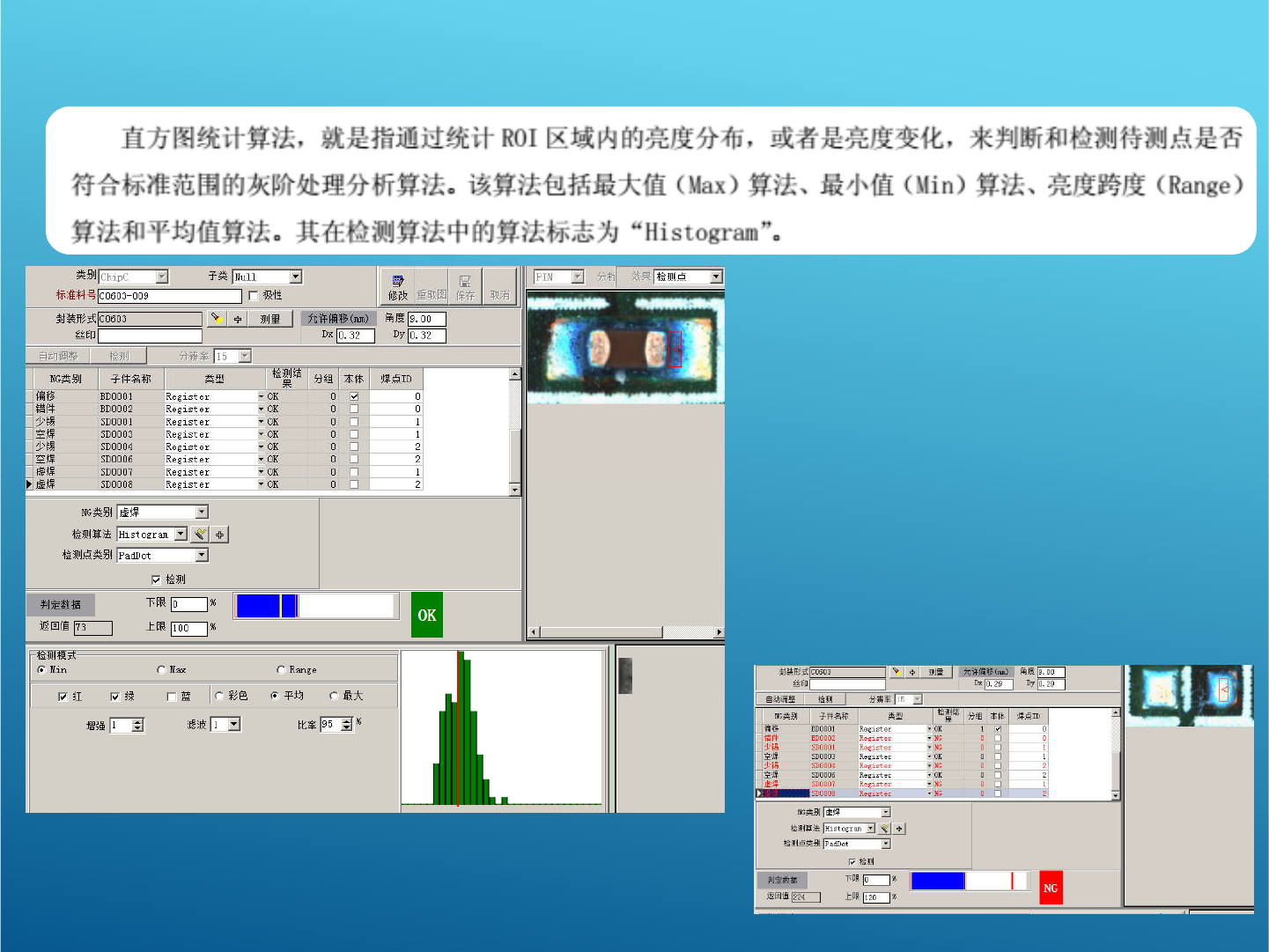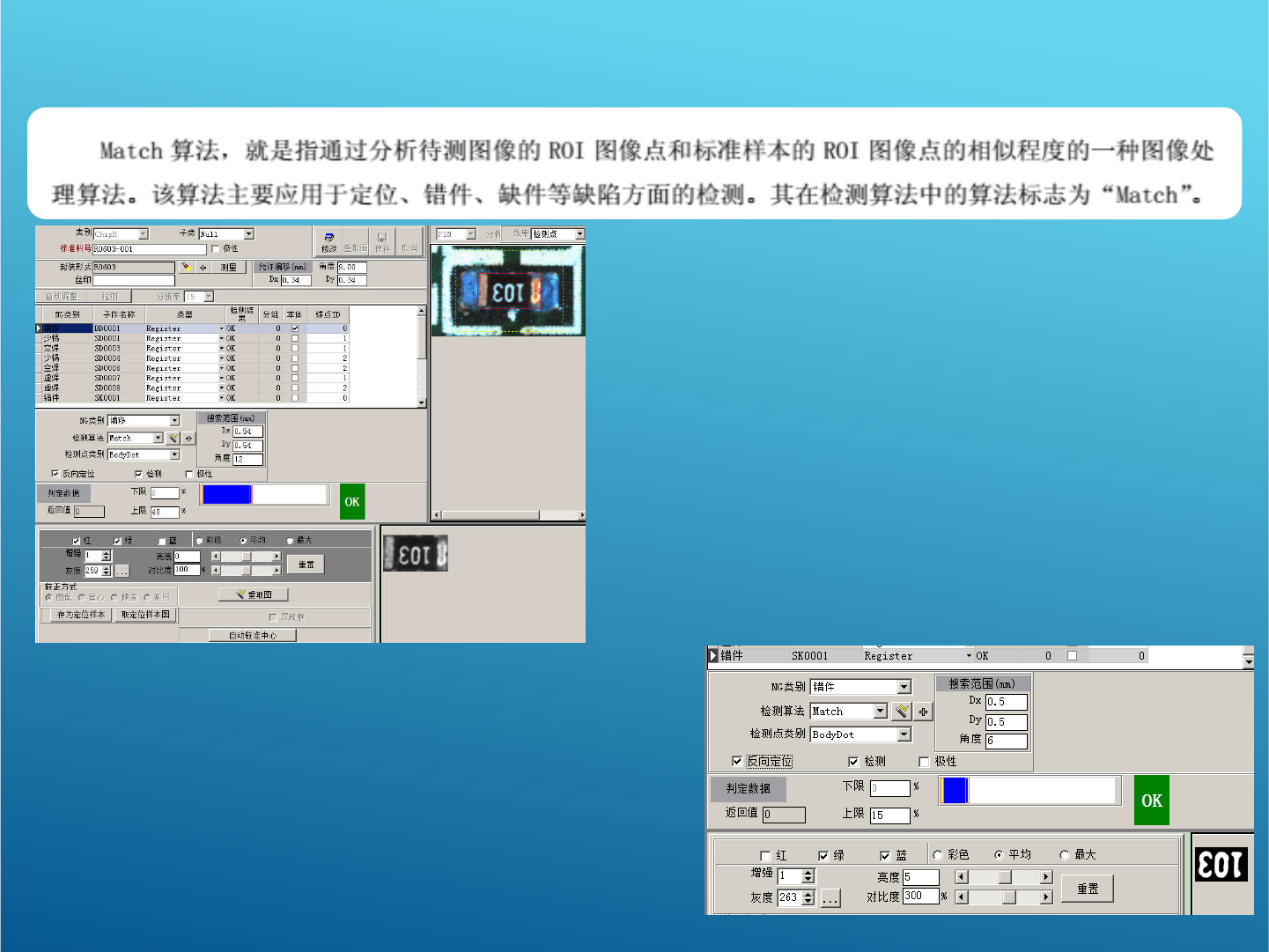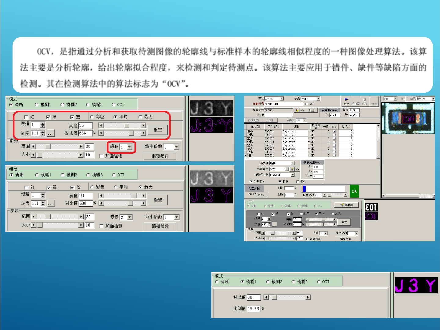 OCV 算法 : (应用模式: 锡膏板,红胶板 ,波峰焊 ) 此算法主要检测字符丝印,有两种模式 1 、清晰模式,主要针对比较清晰的丝 印,提取丝印的外部 轮廓并与待测丝印进 行比对 如果丝印周围有杂质可以更改参数进行调整,如 上图 2 、模糊模式,主要针对比较模糊的丝 印,效果如右 图 .( 注:电阻等比较清晰的丝印不 要用模糊 )