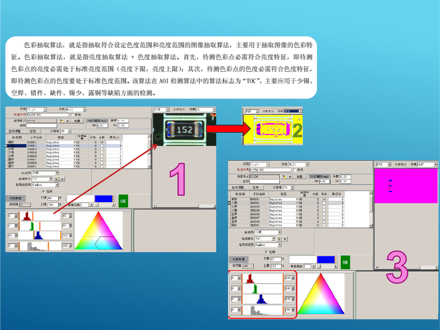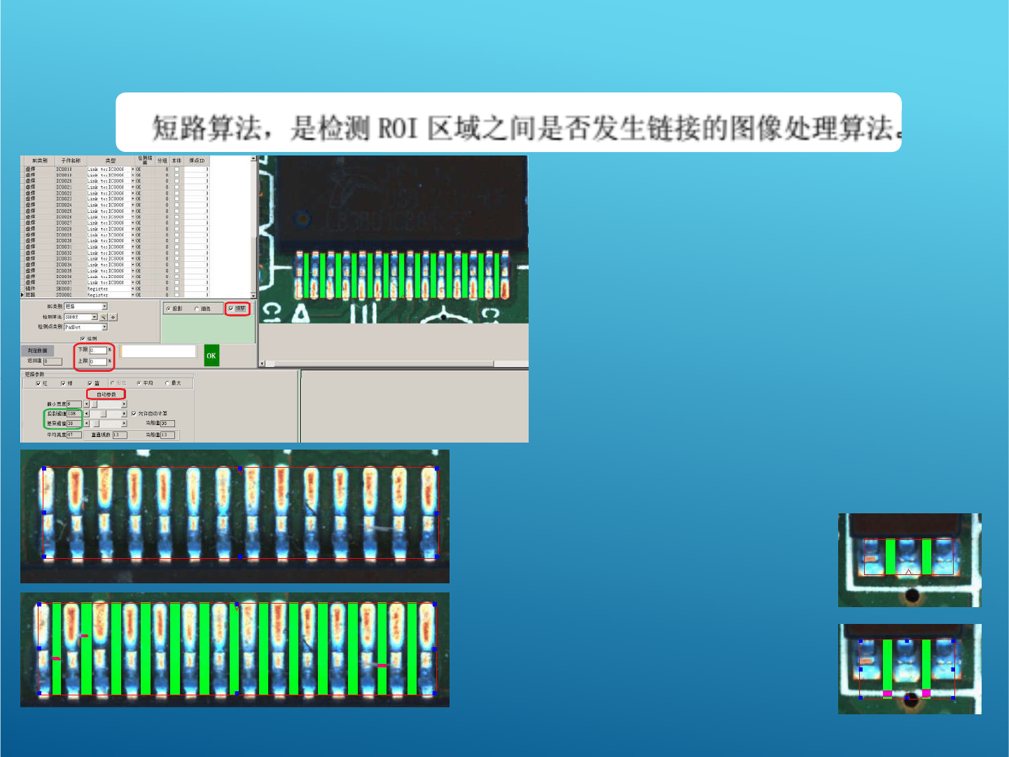 SHOR T 算法 : (应用模式: 锡膏板,波峰焊 ) 框住的区域则为检测区域 所以在制作检测框的时候注意可能会导 致连锡的位 置,适当调整框的位置及大小 因为短路检测项只有两种情况,连锡或 者不连锡 所以上限一定不能修改,一定为零 下面“自动参数”可以由软件自己帮你 设定参数 “投影阈值”主要控制通道的宽度及数 量 (通道即为图中绿色条状位置) (通道即为图中绿色条状位置) “差异阈值”主要控制通道中允许出现 的亮度上限 一般默认 …