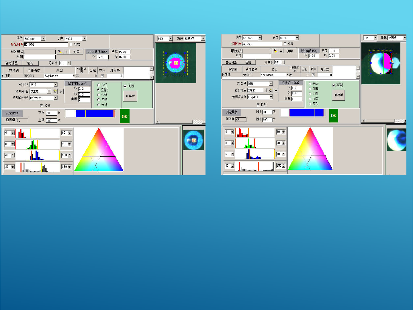 引脚主要检测是否有出脚,检测依据为判定测试区域内是否有深蓝色成分,比例是否能达到要求