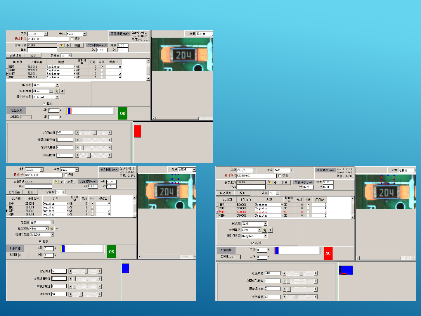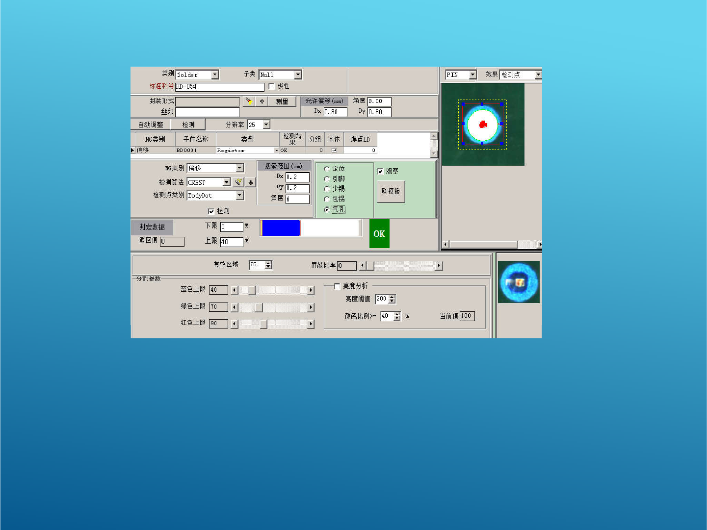 CREST 算法 : (应用模式: 波峰焊 ) 气孔: 气孔项主要检测判定区域内是否有黑色 成分,有则判定为出 现锡洞 锡洞颜色可以更改下方的红绿蓝参数, 值越大越严格