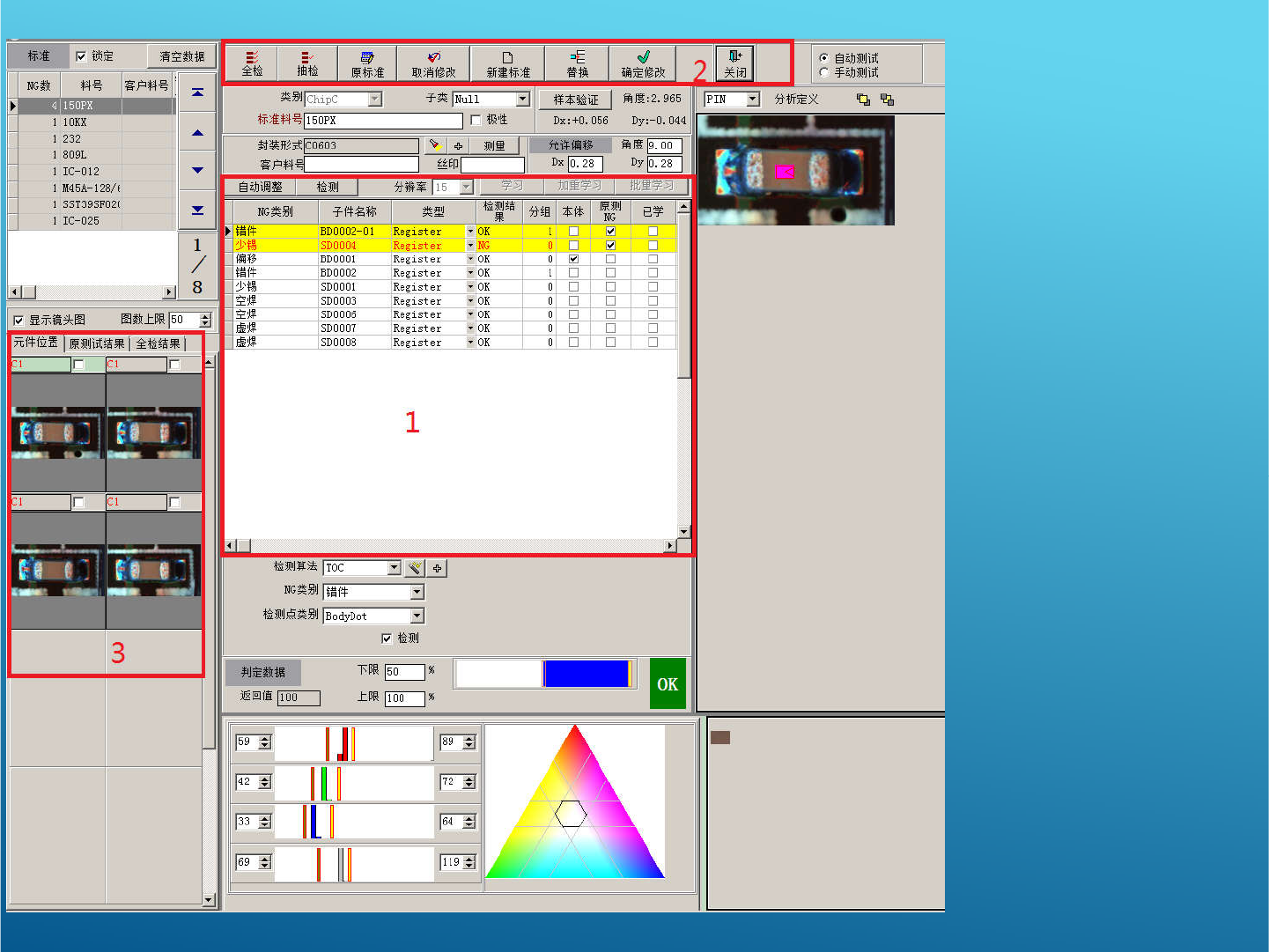 “ 1 ”区域内所报 的 NG 项目调试 OK ,然后点击“ 2 ” 区域内的全检,待 “ 3 ”区域内的图 片名字全部变成绿 色后再点击“ 2 ” 区域内的 “ 确定修 区域内的“确定修 改”