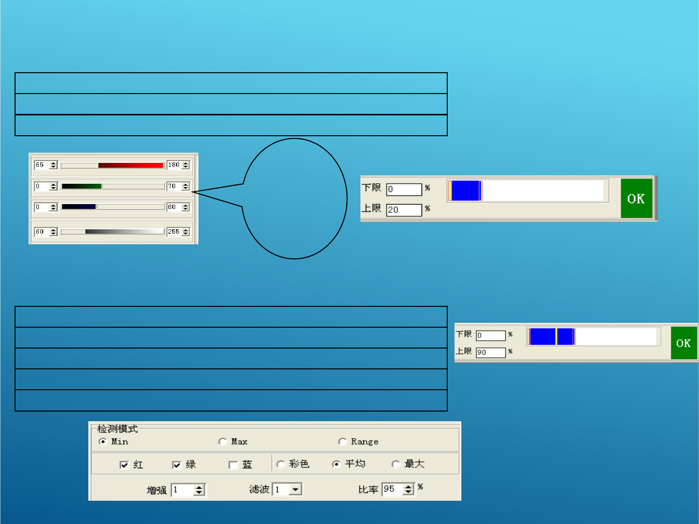 红色:0-85绿色:0-90蓝色:45-180亮度:0-200