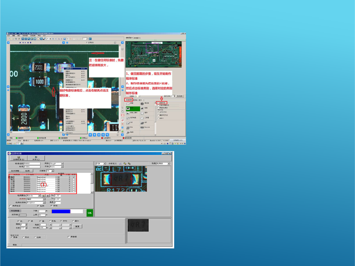 程序制作时有两种方法: 1 导入贴片坐 标制作程序 2 每一颗零件手动制作 元件检测框制作方法: 如右图找到物料之后,在软件右下方 找到 “ 检测类别 ” ,选中所需制 作元件 对应的模块,直接左键拉框框住元器 件,注意虚线框大小,一定要比零件 包括焊盘大一圈,大约为 1 到 2 厘米, 然后直接右键 “ 注册标准 ” 左图为注册元件时所呈现的窗口