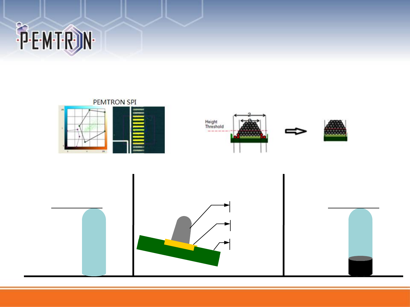 2D 算法 ( 彩色抽取算法 ) 参考面的识别 锡膏面的识别 PEMTRON 独特的彩色抽取算法,能识别 PCB 绿油,丝印,铜箔,锡膏 .