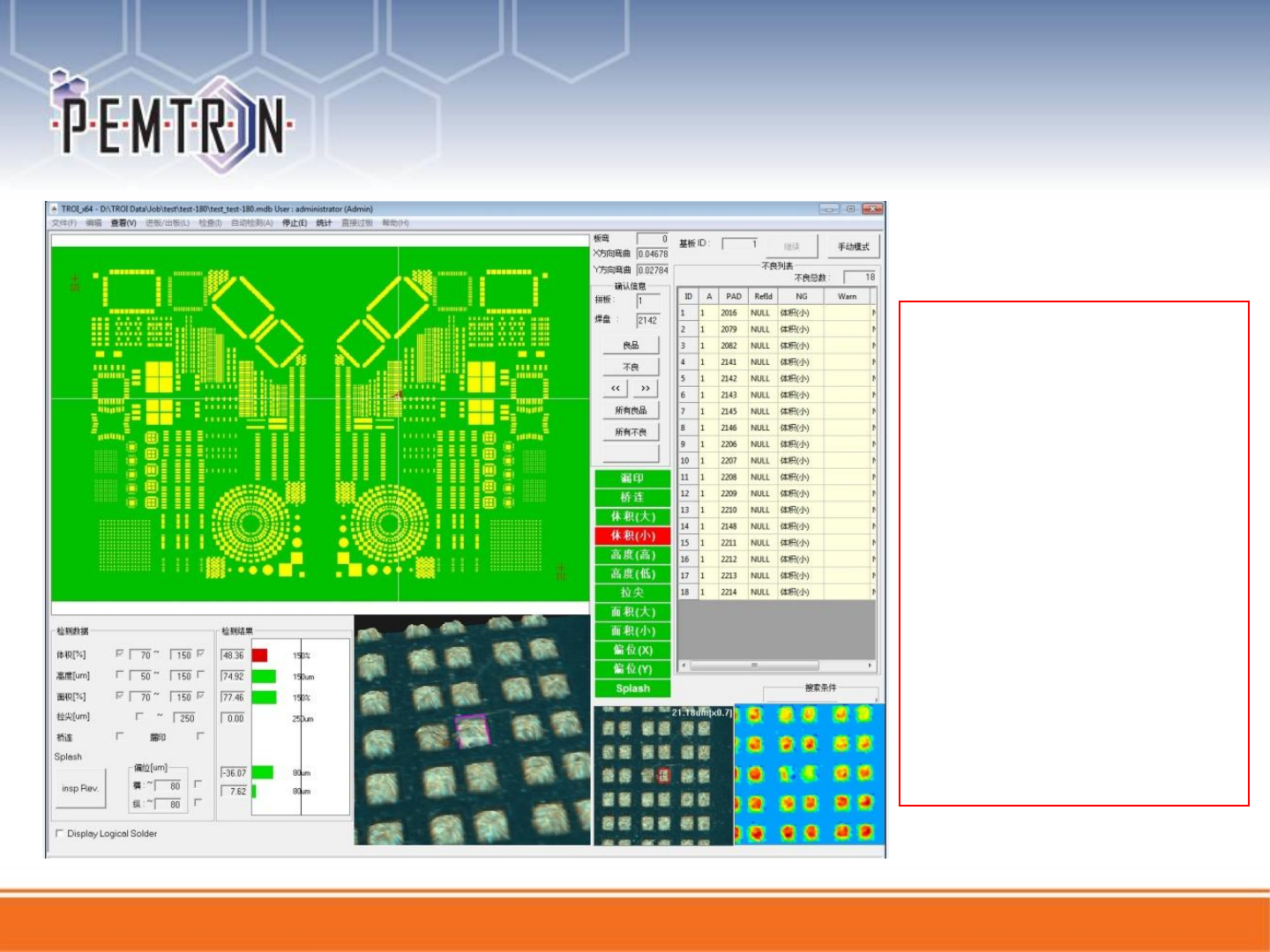 彩色分布图可以通过颜色展示锡膏存在问题(体积,面积,高度过大)PAD的位置分