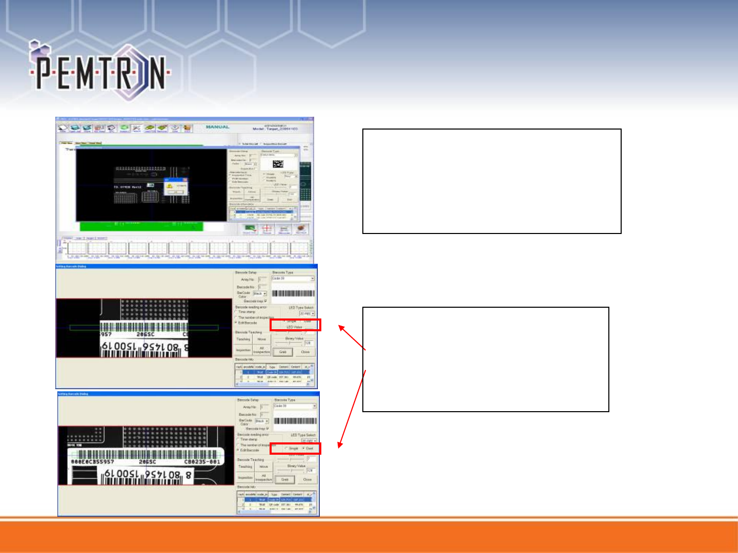 条码读取 ( 正面 ) PEMTRON SPI 能直接读取 正面的 1 维或者 2 维条码,可 以为客户节省成本,而且非常 实用 新功能 : 1. Single – 一个视野读取 2. Dual – 两个视野读取