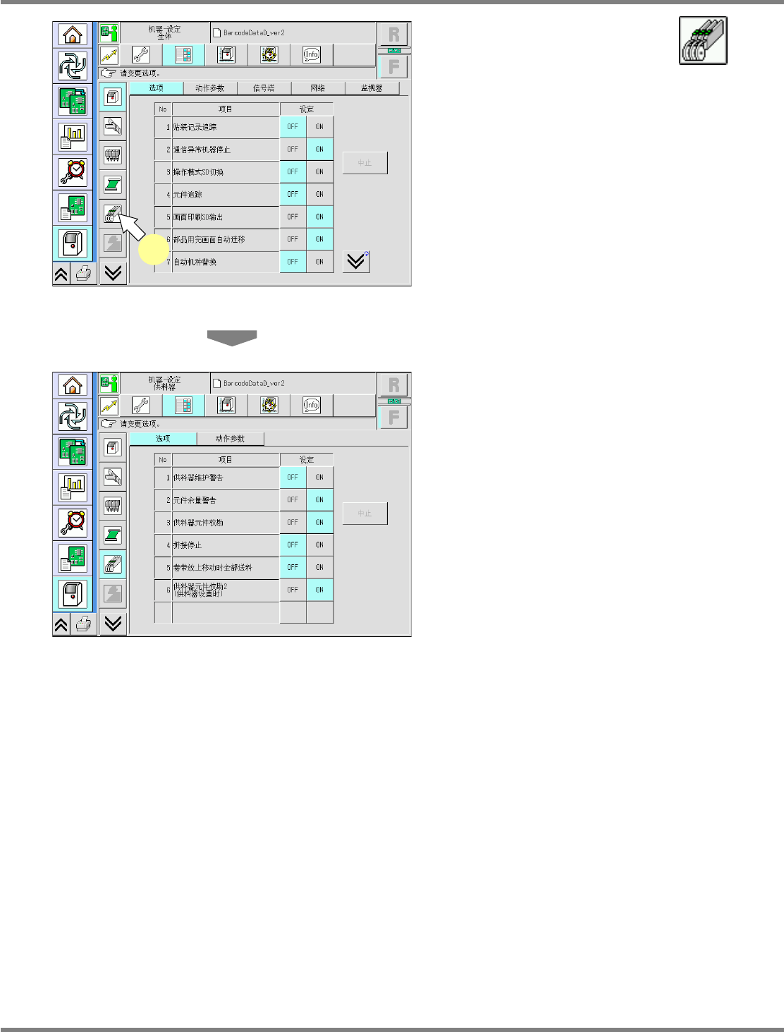 NPM-D 上一级通信 6.1 机器设定 EJM1DC-MB-06F -00 Page 6-3 4 按选项设定 ( 全体 ) 画面的 。 • 显示出选项设定 ( 供料器 ) 画面。 5 在选项设定 ( 供料器 ) 画面上进行各种 选项的设定。 H-IF6-1003_C 4 H-IF6-1004_C