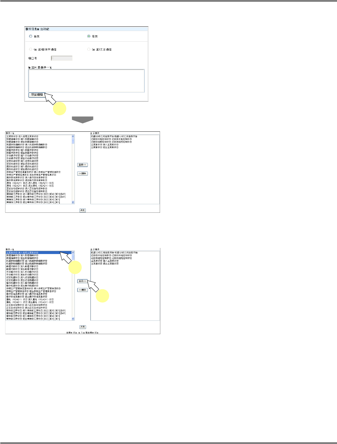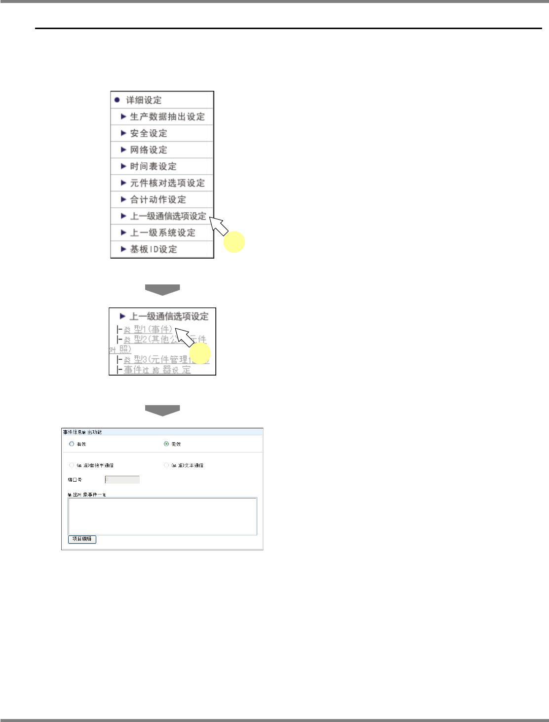 NPM-D 上一级通信 6.2 LNB 的设定 EJM1DC-MB-06F -00 Page 6-7 6.2 LNB 的设定 6.2.1 类型 1 ( 事件 ) 设定 在上一级系统上设定选项类型 1 ( 事件 ) 。 1 在主菜单中点击 [ 详细设定 ] 的 [ 上一级 通信选项设定 ] 。 • 打开子菜单。 2 点击 [ 类型 1( 事件 )] 。 • 显示出 < 事件信息输出功能 > 画面。 3 设定选项的有效 / 无效…