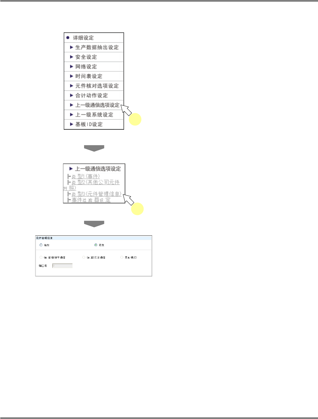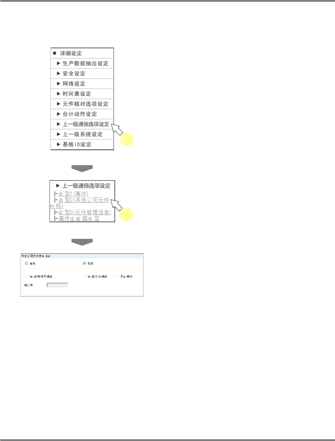 NPM-D 上一级通信 6.2 LNB 的设定 Page 6-10 EJM1DC-MB-06F-00 6.2.2 类型 2 ( 其他公司元件对照 ) 设定 在上一级系统进行选项类型 2 ( 其他公司元件对照 ) 的设定。 1 在主菜单中点击 [ 详细设定 ] 的 [ 上一级 通信选项设定 ] 。 • 打开子菜单。 2 点击 [ 类型 2( 其他公司元件对照 )] 。 • 显示出 < 其它公司元件核对系统 > 画面。 3 设定…