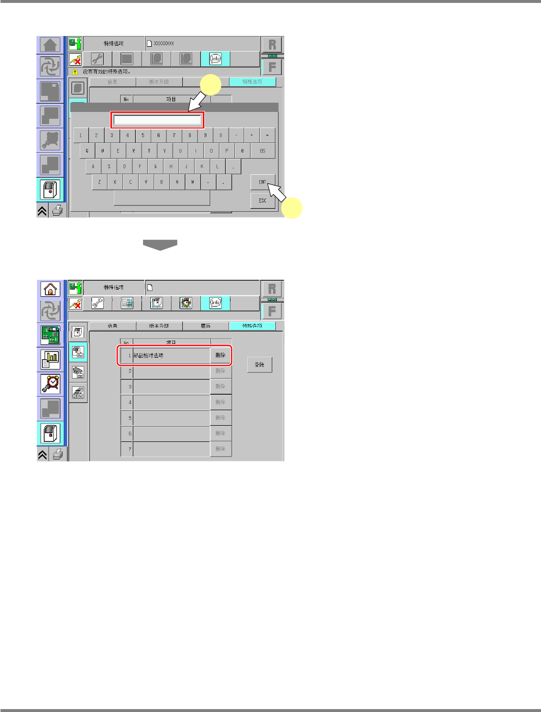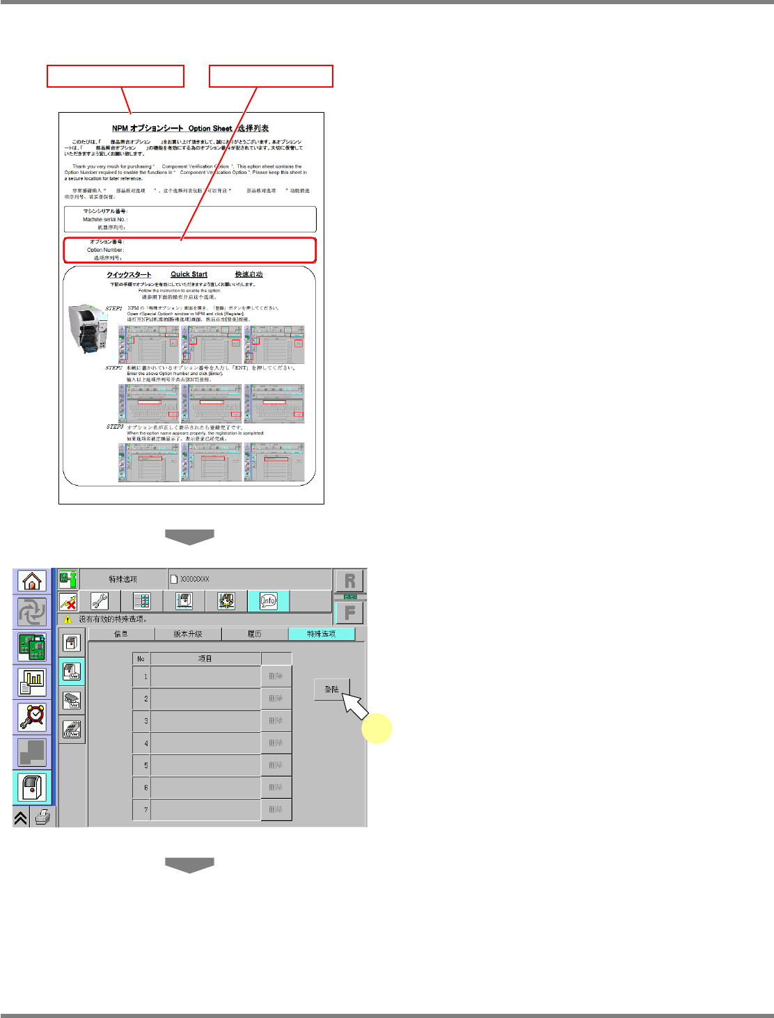 NPM-D 上一级通信 7.2 选项许可 EJM1DC-MB-07F -00 Page 7-5 3 输入 “ 选项编号 ” 。 输入选项单记载的 “ 选项编号 ” ,按 [ENT] 。 ∗ 选项列表中记载的序列号和,设备上 粘贴的产 品标签板的序号如有不同,选项编号 将不能登 录。 4 显示登录的选项。 UnitVerWhole SpecialOption -02C01 3 3 UnitVerWhole SpecialOption -0…
