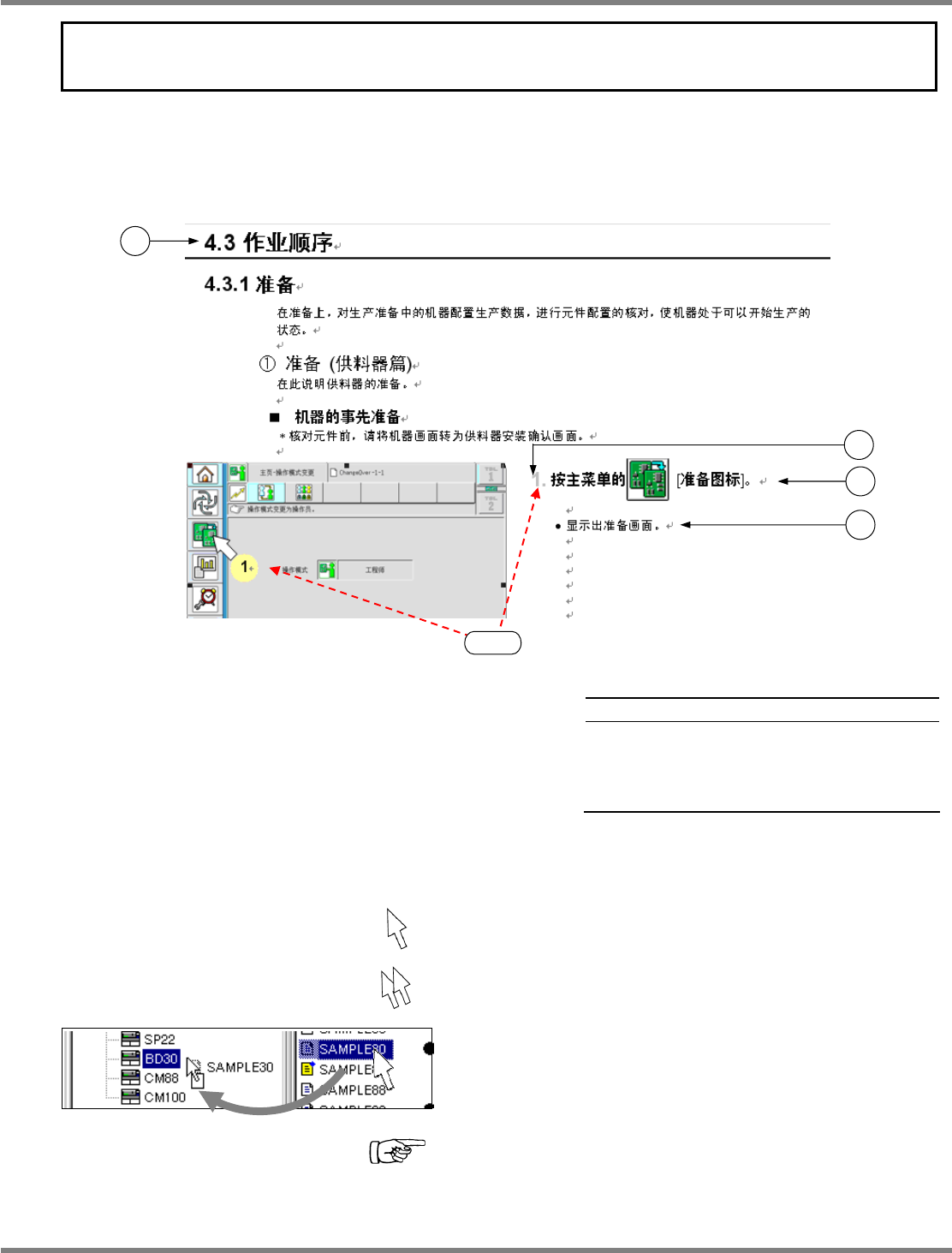 NPM-D 上一级通信 EJM1DC-BP-01F-00 Page 5 关于正文中表示方法 操作说明的阅读方法 每页或许多少有些差异,但基本上均 按下述构成进行说明。 说明 c 标题 d 操作步骤编号 e 实际操作 f 操作的补足说明 本书中使用的记号 在本书中,使用下述记号进行说明。 : 表示点击部分。 ( 附带的数字表示在该画面点击的 顺序。 ) : 表示双击部分。 733C-CPt-Fi-049 : 表示拖放操作, 即按住…