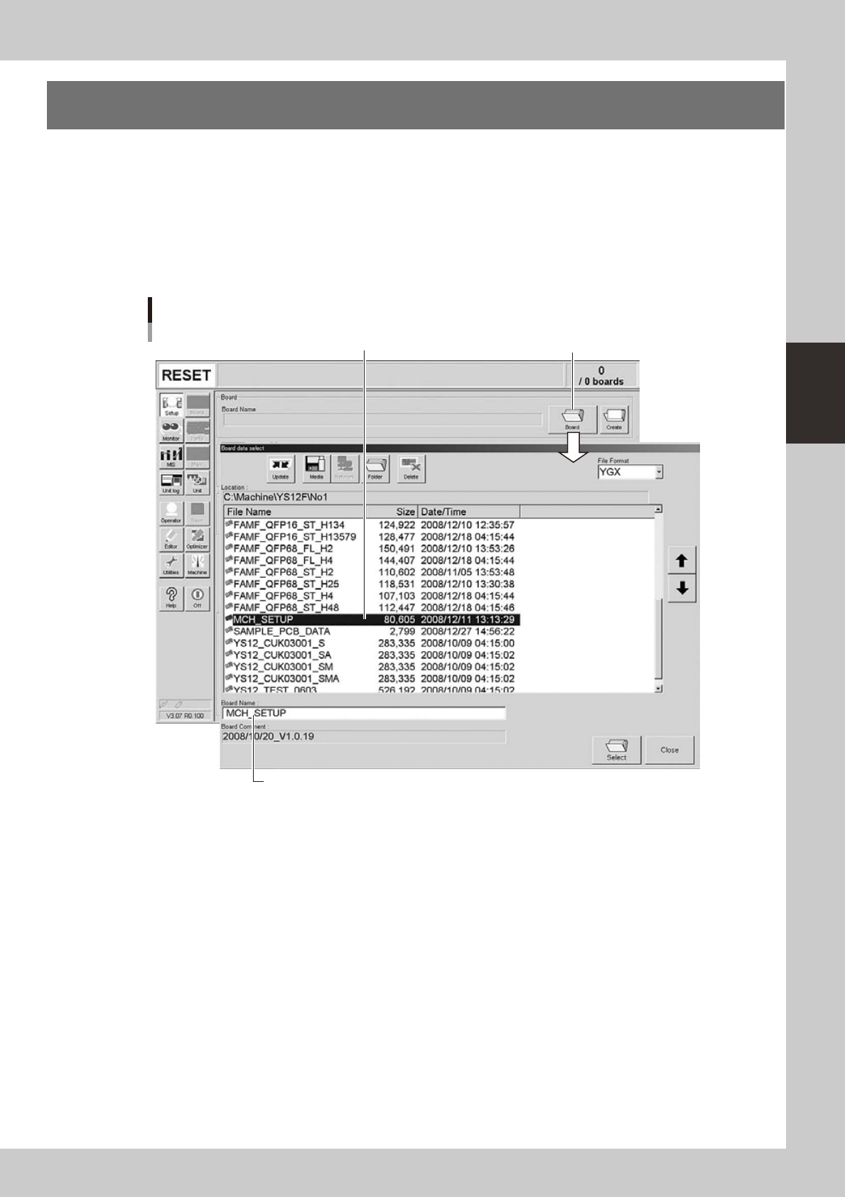 1. When the board data is not yet selected, press the [Board] button on the Setup screen.