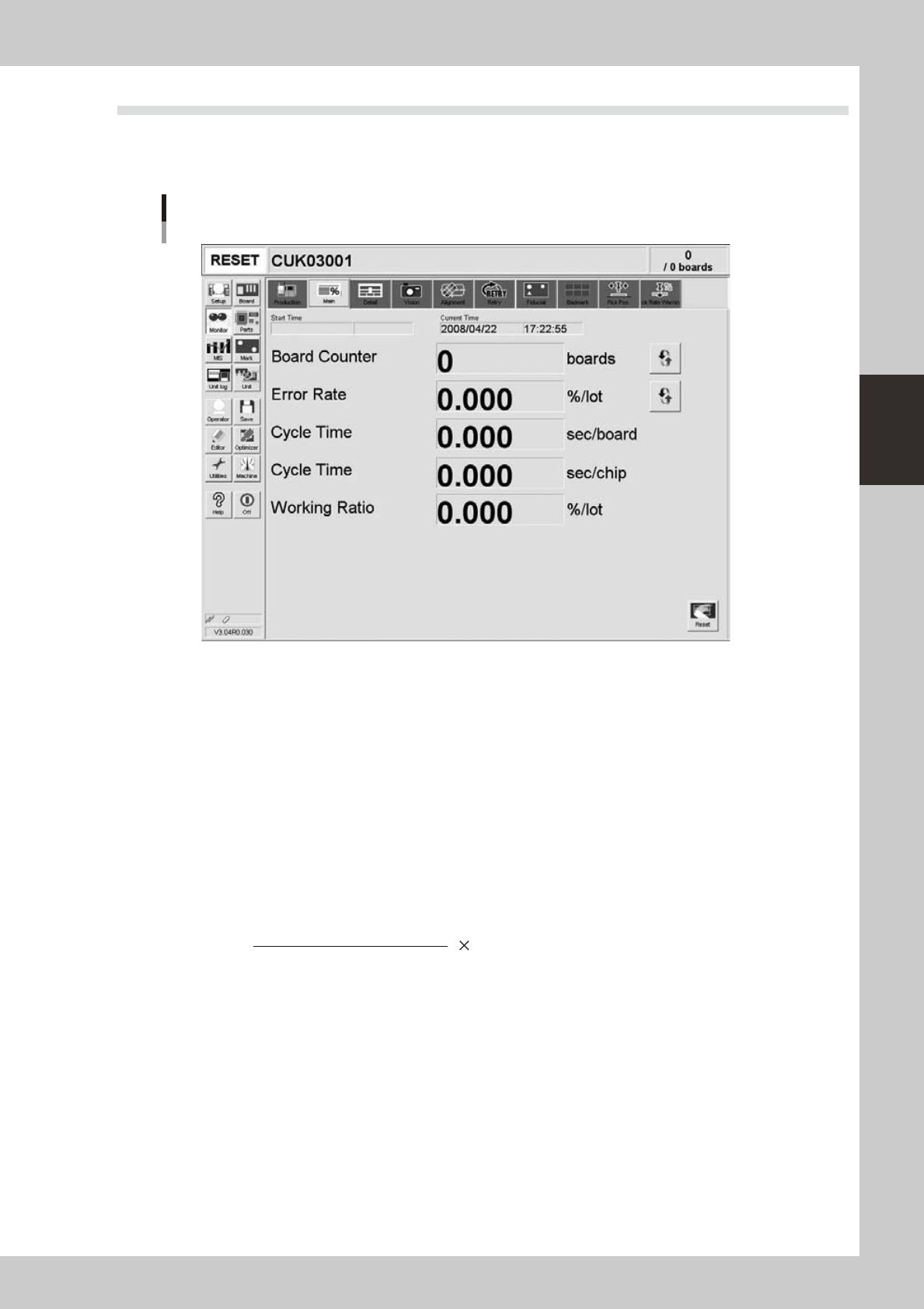 3-15 3 Starting and ending pr oduction 3.2 Main T he [Monitor]-[Main] tab screen shows you the real-time production status such as the board count and c ycle time. Displa ying this screen during production is handy . All…