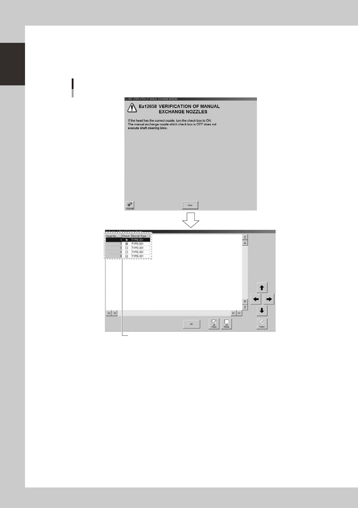 Pressing the [Close] button in the dialog box displays a screen for checking manual change nozzles as