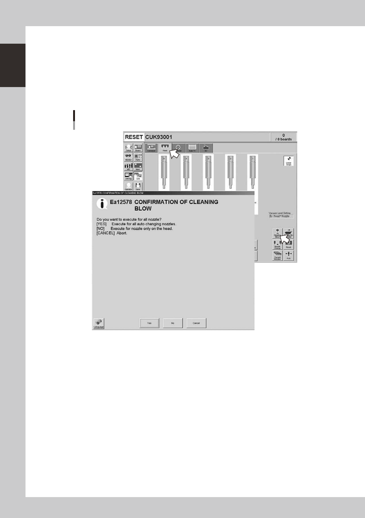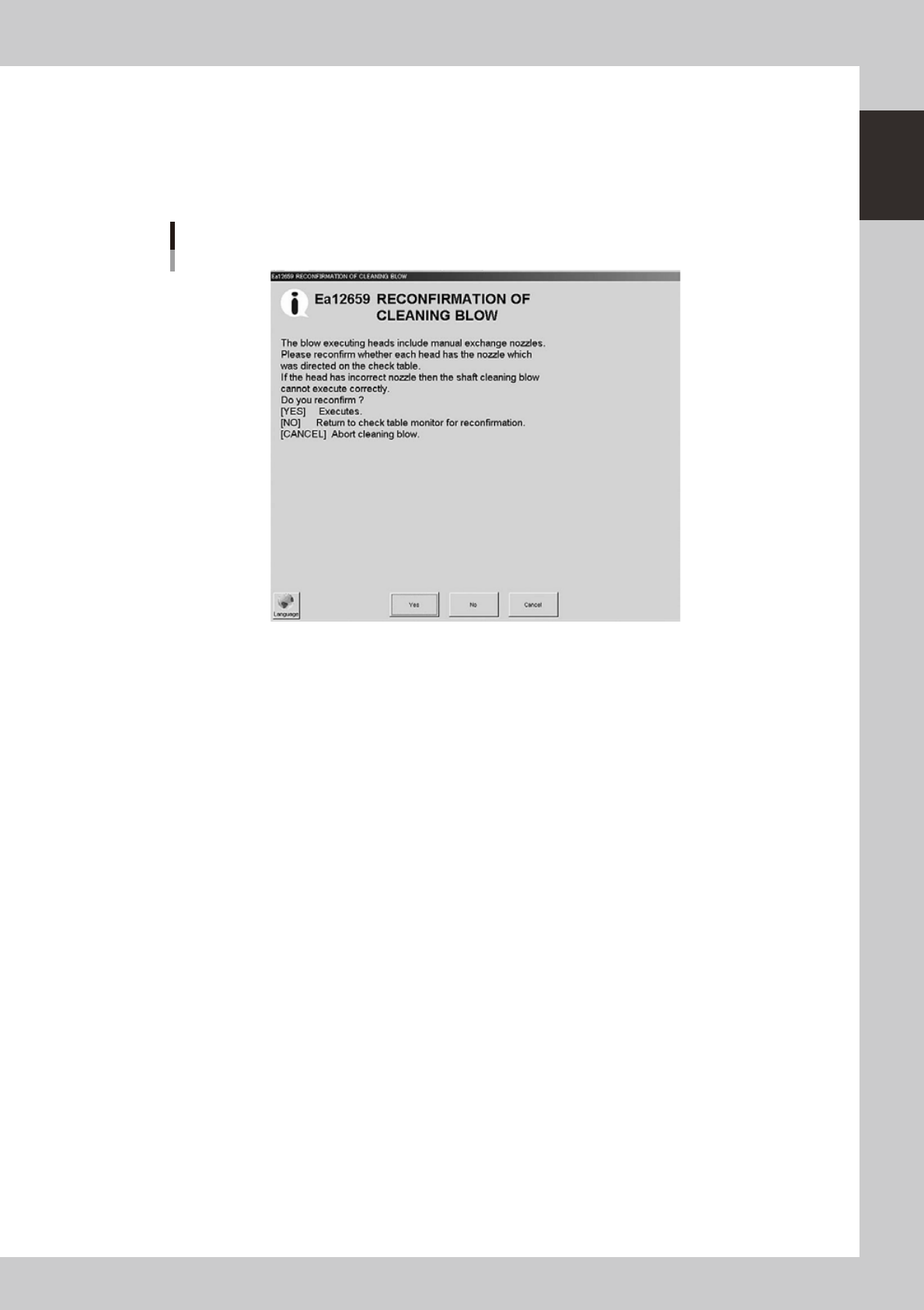 1-23 1 Part names and functions 5 A confirmation dialog box appears asking y ou to make a final check. Check the contents of the dialog box and pr ess the corresponding button. [YES] : Perfor ms nozzle shaft blow of the …