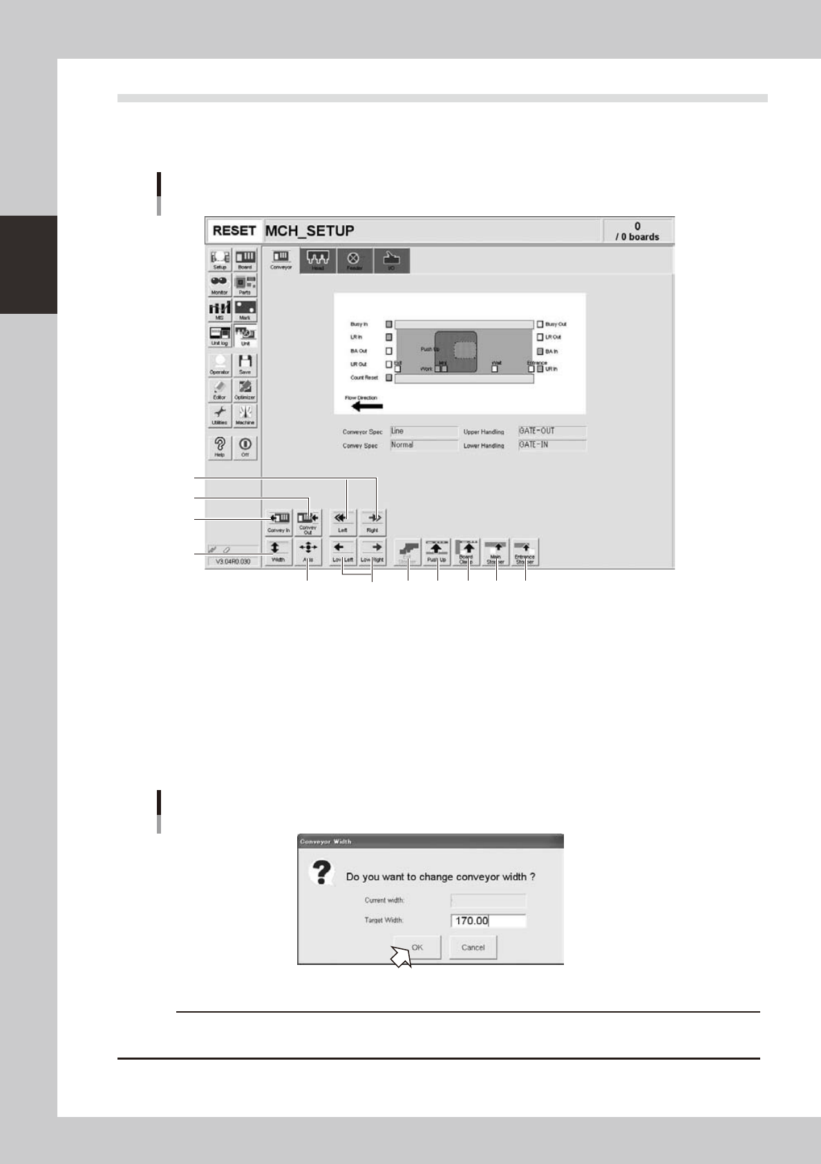 Pressing this button displays the "Conveyor Width" dialog box. Check the conveyor width and press the [OK] button. The