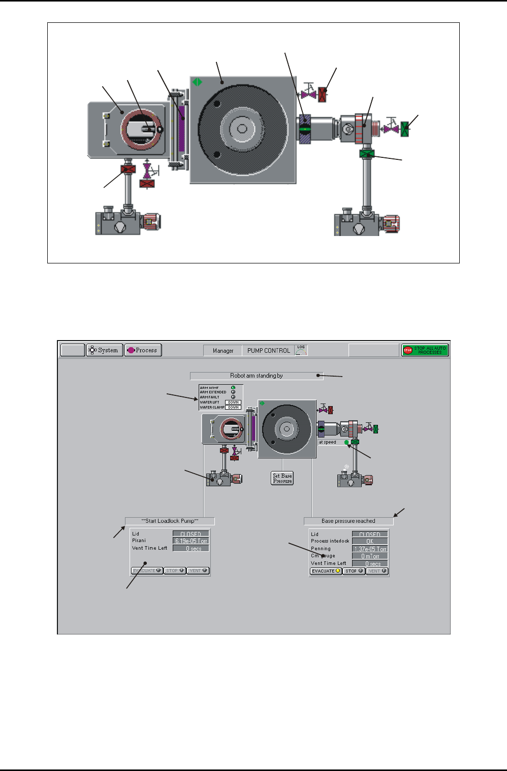 The vacuum system mimic is shown in Fig 5.11. Each chamber contains a wafer indicator