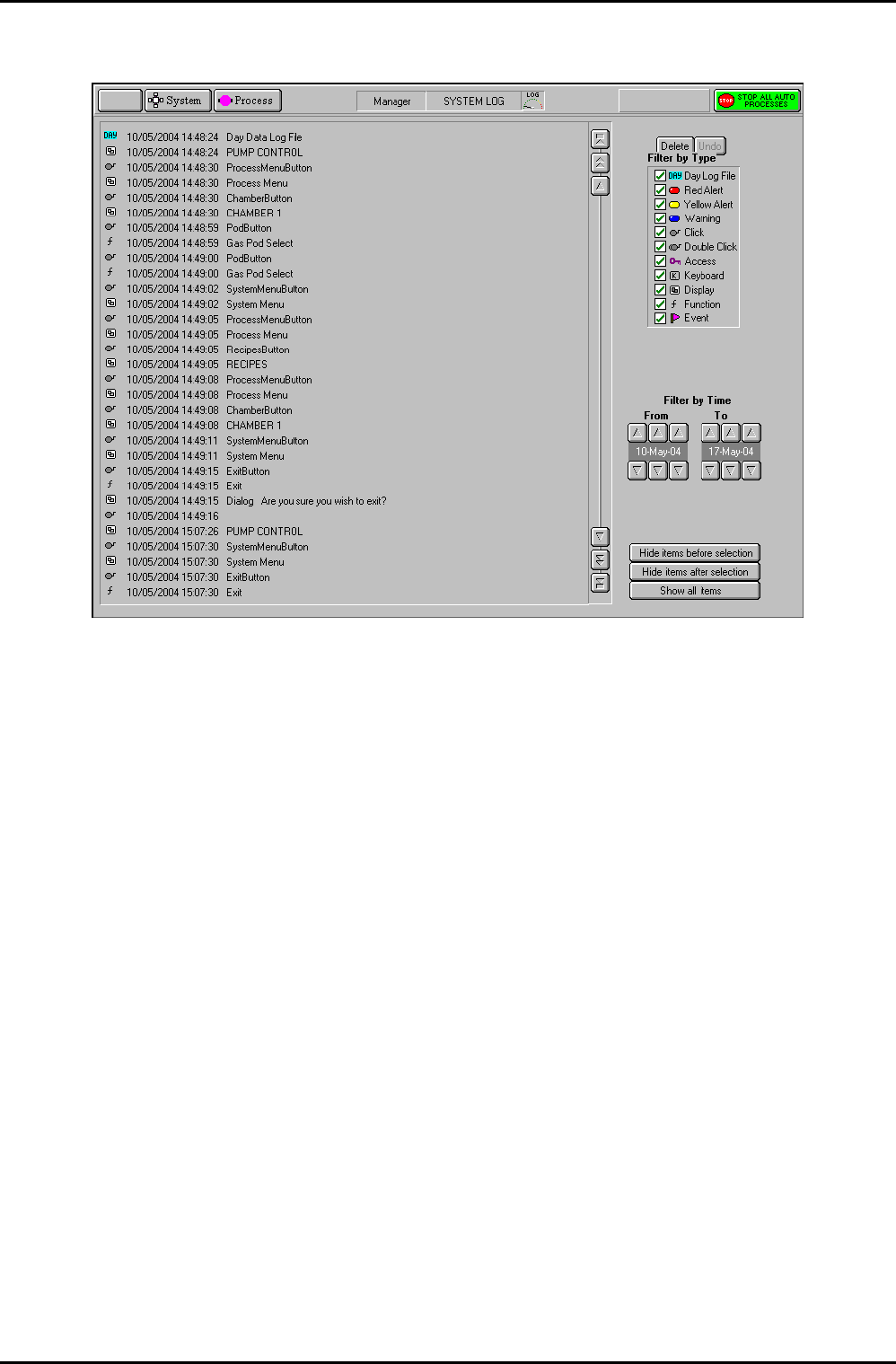 The system log page allows logged system events to be viewed. A filter facility allows the
